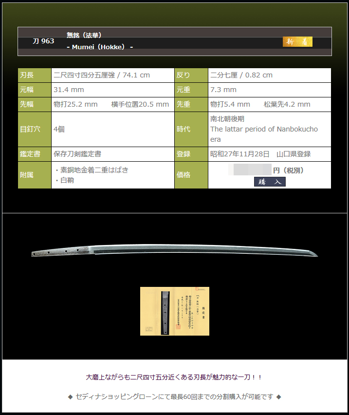 現状は古研ぎで薄らと蜘蛛の巣が張ったような錆びが見られます。再研磨頂き大切に御所持頂きたいとの思いから、研磨代を考慮した低価格で御案内差し上げます。