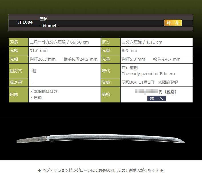 白鞘新調、研磨代等を考慮し、お求め易い低価格で御紹介致しますので、迫力ある大切先の御刀をお探しの方は是非ご検討下さい。