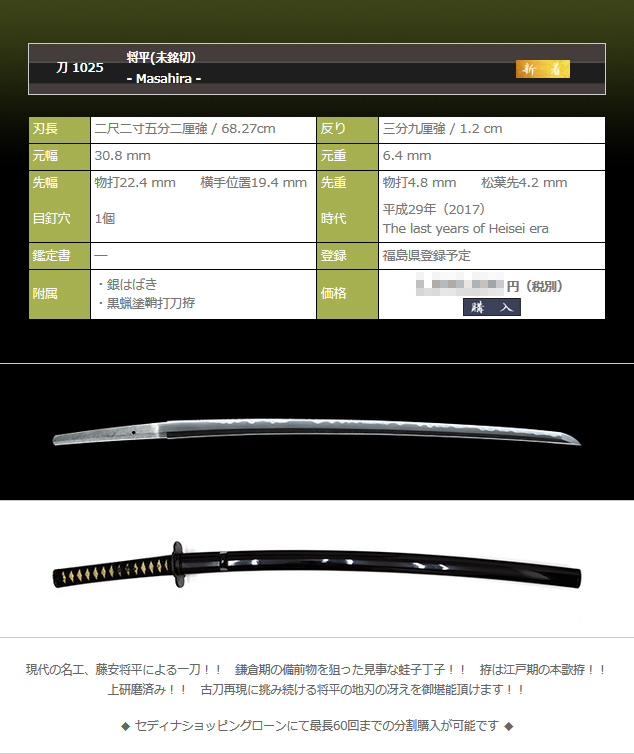 この刀は保存状態が良い江戸時代の本歌拵に合わせて鍛えた一刀。小板目肌良く練れて詰み、地景入り、映り立ち、刃文は匂口明るく冴えたふんわりと柔らかい丁子刃を焼き上げ、足盛んに入り、砂流かかり、蛙子丁子を交え、鎌倉中期の備前刀を見るが如き出来口を誇っています。平成27年頃から将平刀匠は、燭台切の作者として名高い備前の名工、光忠の写しを手掛けており、拵に合わせて鍛えたため、姿こそ違えど地刃は光忠等を狙ったことが出来口から感じ取られます。