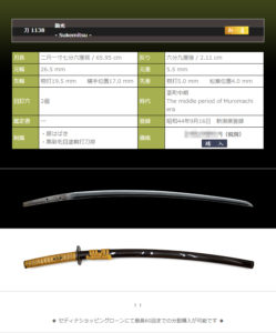 附属の拵は桐図で統一されており、格式の高さを感じさせます。古い刀だけあって刀身の重量も軽く、手持ちのバランスも良く、内外共にお値段以上の価値ある一刀です。