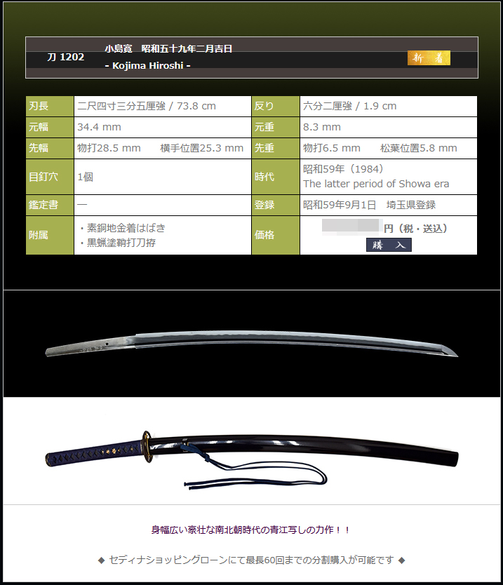刀工銘、慶雲直弘。本名小島寛。埼玉県所沢市出身。児玉町住。柳川直弘の門人で、大慶直胤門人の初代直弘から数えて五代目の刀工にあたります。
