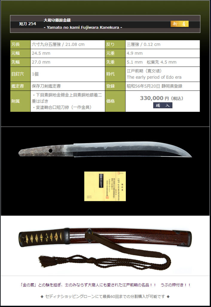 裸身重量770グラム。 拵に納めて鞘を払った重量1,048グラム。