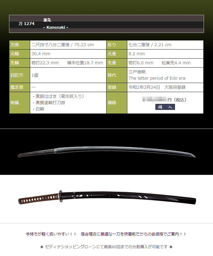 附属の拵は店主町井勲監修の下製作した武用拵ですので、柄に捻じれ無く、刀身と柄の芯合わせも完璧です。写真には写っておりませんが、柄と同色の下緒が附属しています。