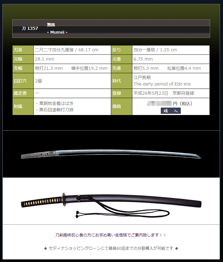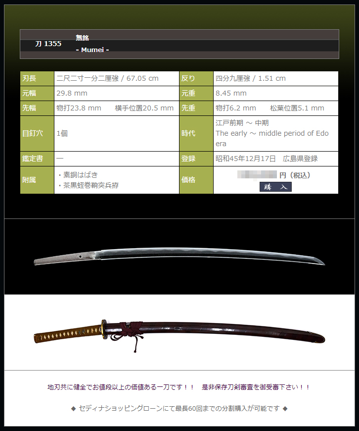 裸身重量1,013グラム。 拵に納めて鞘を払った重量1,420グラム。