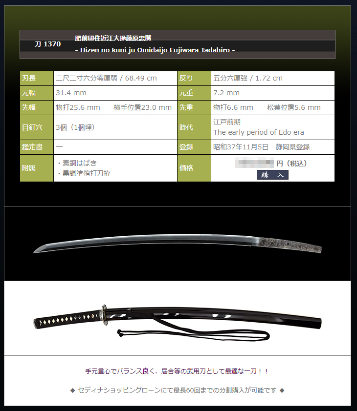忠廣銘に関しては首肯できかねるため、無銘の刀としてお求め下さい。当店にて店主町井勲監修の下、武用拵を新調致しました。鞘から払って構えてみると、手元重心でバランスが良く、居合等の武用刀として扱い易さを感じさせる一刀です。