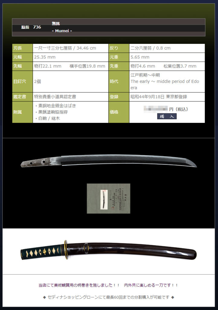 裸身重量925グラム。 拵に納めて鞘を払った重量1,160グラム。