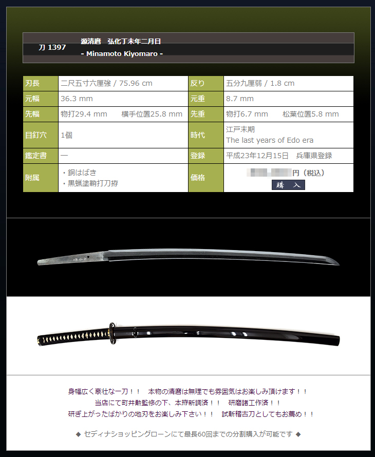 当然のことながら柄にガタツキは無く、はばきと切羽も本刀に合わせて誂え、研磨も当店にて行いましたので、斬味も太鼓判を押させて頂きます。是非この機会に店主町井勲監修の諸工作を手掛けた一刀をお求め下さい。