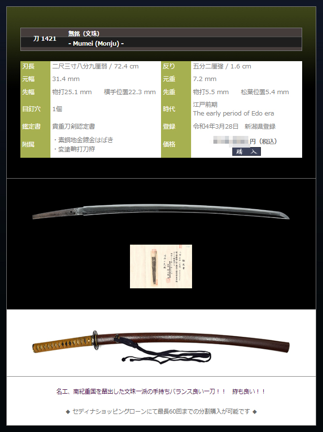 同派からは南紀重國も排出しており、新刀然たる派手な刃文がもてはやされたこの時代に於いて、文珠派は大和伝を墨守した古雅な作品を数多く遺しています。