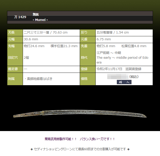 刀身中央よりやや手前重心なので、拵を付けると更に手元重心になり、扱いやすい一刀に仕上がることでしょう。既製品の鞘に納まるので、町井勲監修の簡易武用拵でしたら77,000円(税込)にて製作可能です。