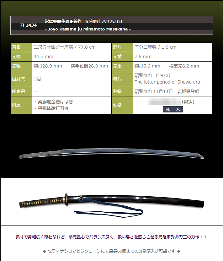 元先の幅差開いて切先延びごころ。スラリとした体配が魅力的な造り込みで、現状では改正砥(砥石目千番)迄の白研ぎ状態です。刃文は直刃系。刃筋確認のための試斬稽古や居合の形稽古でも、現状で充分お使い頂けます。地刃が見えるよう化粧研ぎまでご希望される場合は63万円(税込)となります。
