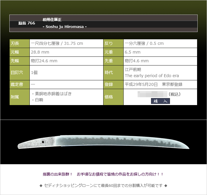 正廣銘に関しては首肯できかねますので、出来の良い無銘皆焼脇指としてお求めください。