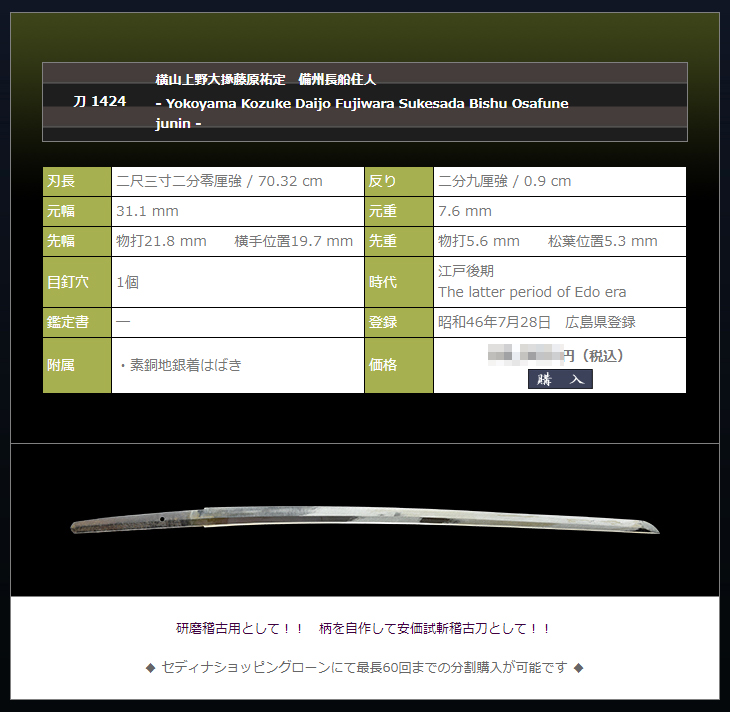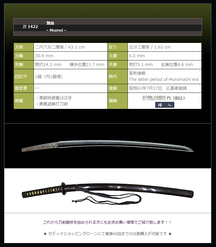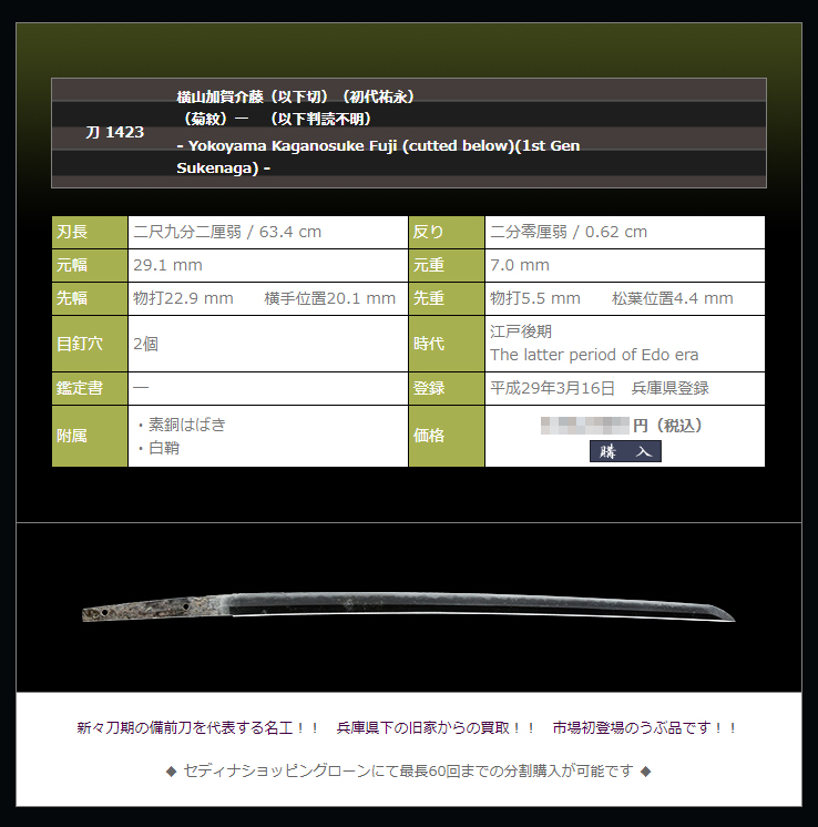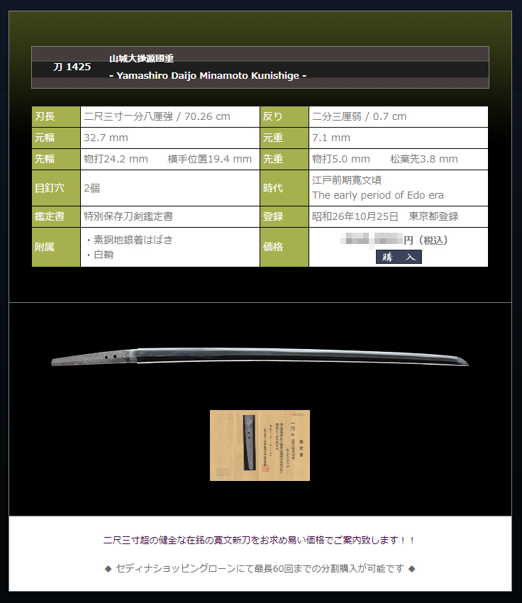 銘に関しては首肯できかねますので、刃長二尺三寸ある無銘刀としてお求め下さい。